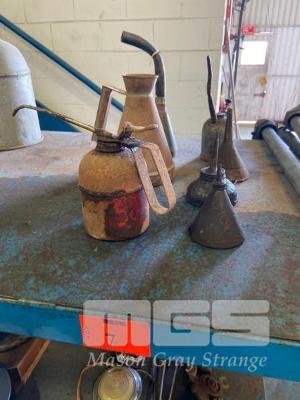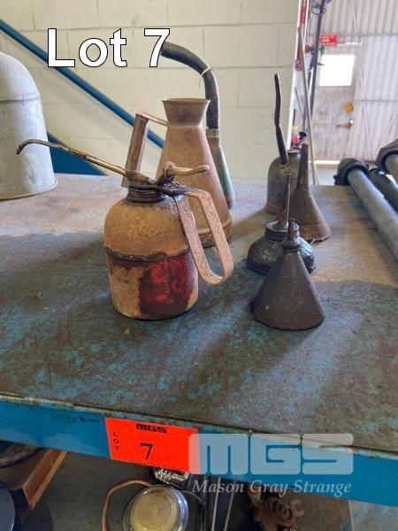 5 x OLD HAND OIL CANS & 2 FUNNELS