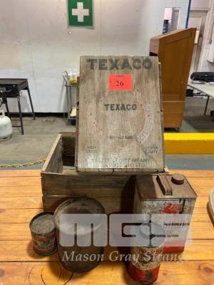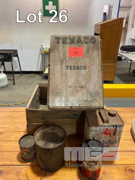 2 x WOODEN SPIRITS CRATES & ASSORTED CANS CASTROL & MOBIL OIL GREASE & OIL MEMORABILIA