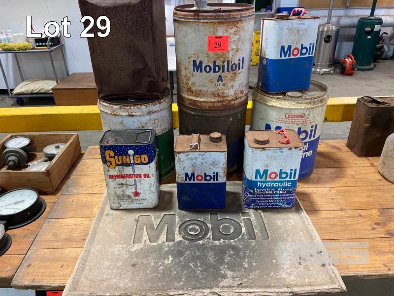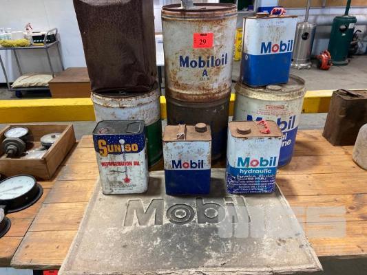 9 x ASSORTED EARLY OIL CANS MOBILE OIL, SONISO & MOBIL SPILL BASE