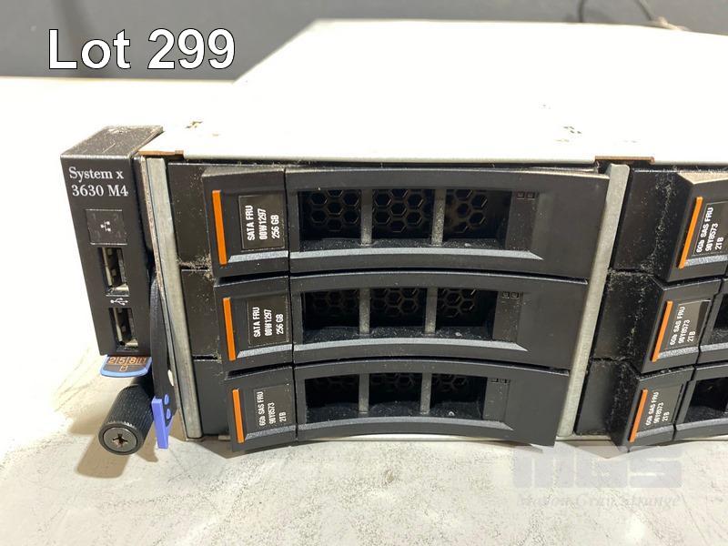 RACKMOUNT SERVER, IBM SYSTEM x3630 M4 (7158FT1), 2U, 2 x XEON E5-2470 @ 2.3GHz, 96GB ECC DDR3 RAM, 2 x 256GB SSD, 10 x 2TB SAS HDD, 2 x 750W PSU (NO CABLES) S/N:06VRCP5