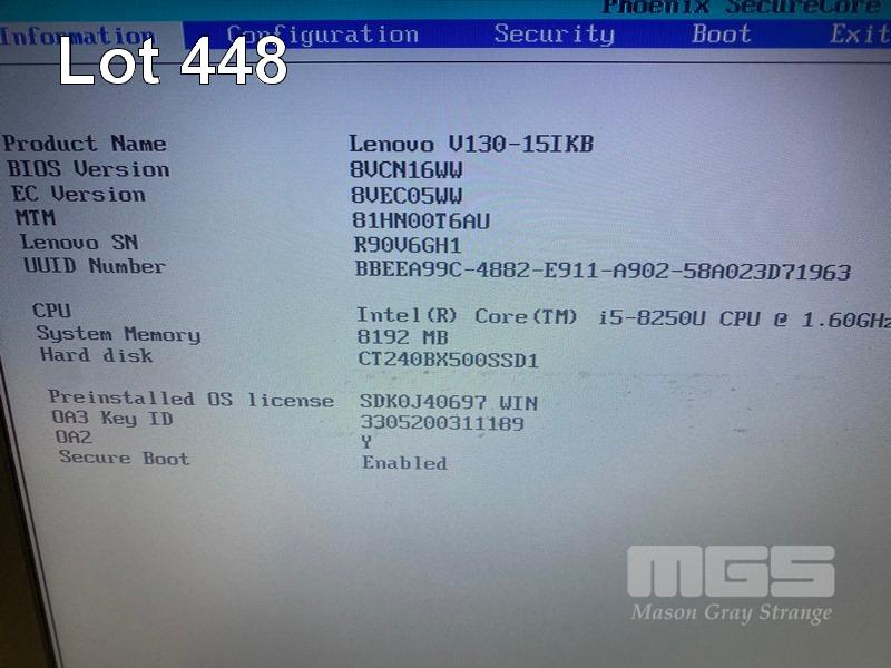 LAPTOP, LENOVO V130-15IKB, CORE i5 8250U (8TH GEN) @ 1.6GHz, 8GB DDR4 RAM, 240GB SSD, 15.6" WIDESCREEN (1366x768), Wi-Fi, BLUETOOTH, WINDOWS 10 PRO INSTALLED & POWER SUPPLY (NOTE: MARKS ON SCREEN) S/N:R90V6GH1