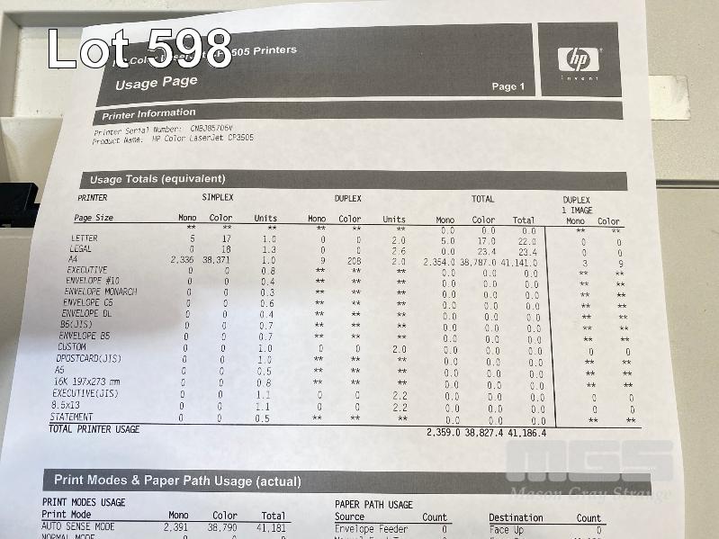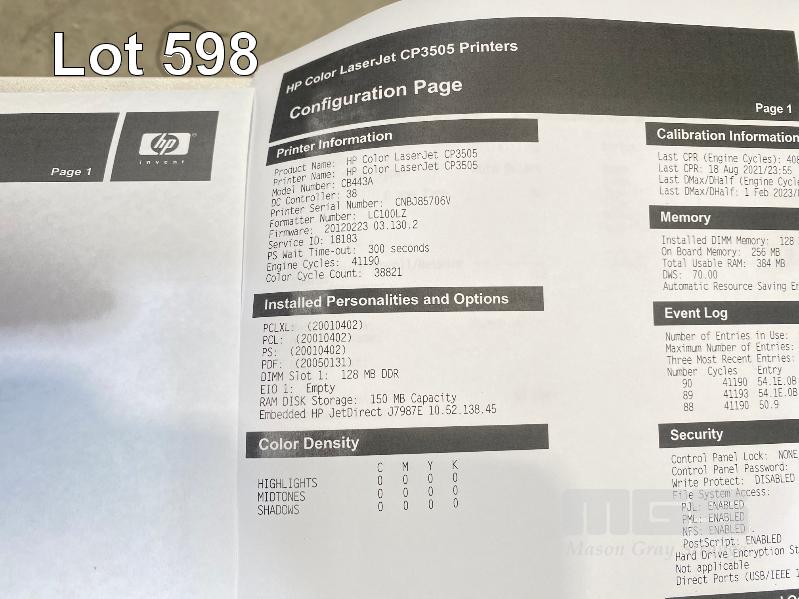 PRINTER, HP COLOUR LASERJET CP3505dn LASER, USB, NETWORK, 41,186 PAGES (TEST PAGE ATTACHED - ONLY PRINTING IN B&W) S/N:CNBJ85706V
