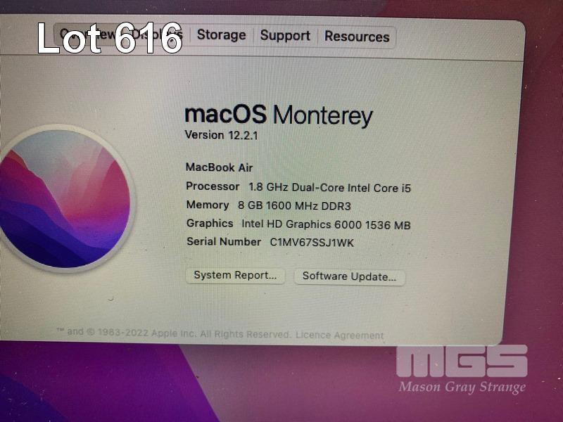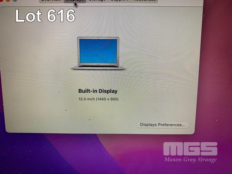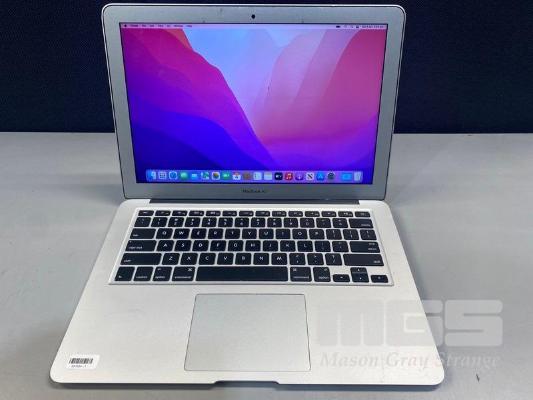 LAPTOP, APPLE MACBOOK AIR (A1466), CORE i5 5350U (5TH GEN) @ 1.8GHz, 8GB DDR3 RAM, 128GB SSD, 13.3" WIDESCREEN (1440x900), INTEL HD GRAPHICS 6000, Wi-Fi, MAC OS 12 INSTALLED & POWER SUPPLY (NOTE: MINOR MARKS ON SCREEN, NOISY FAN) S/N:C1MV67SSJ1WK