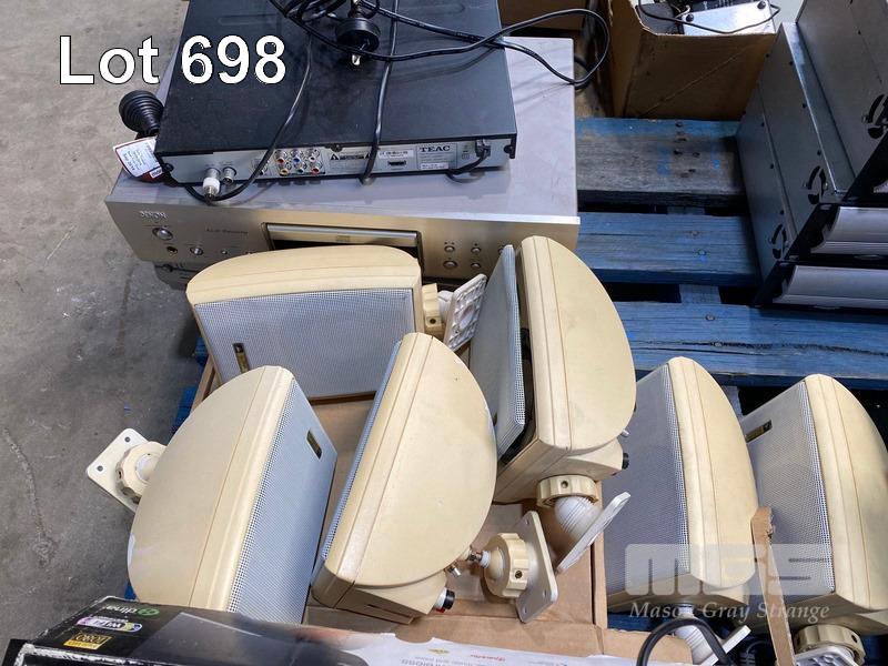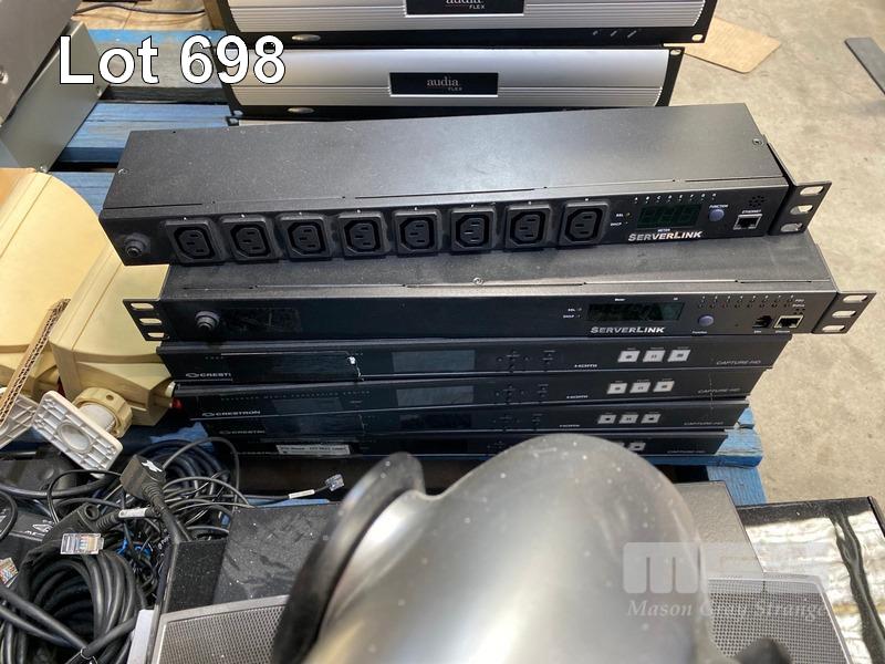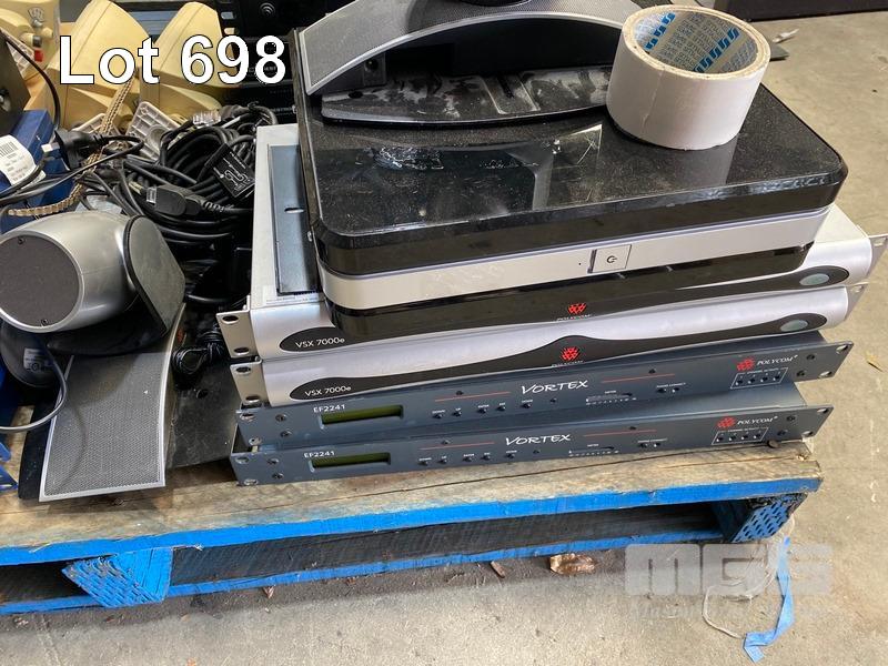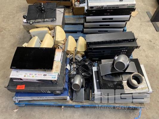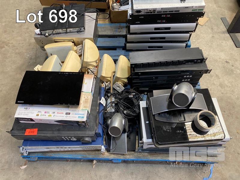PALLET LOT ASST AV INCLUDING SPEAKERS, BLU-RAY PLAYER, NVR, POLYCOM, SERVERLINK, NEXIA, AUDIA FLEX, ETC