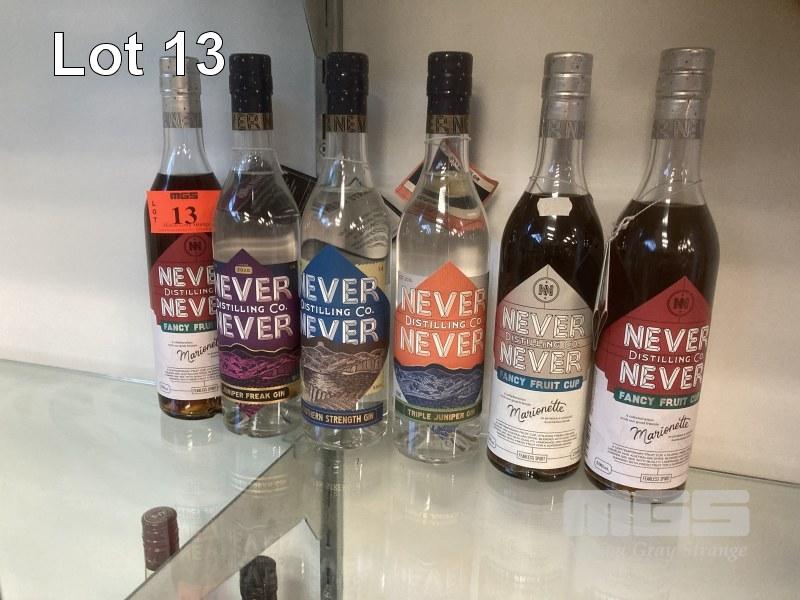 6 x BOTTLES ASSORTED NEVER NEVER DISTILLERY GINS, 500ml