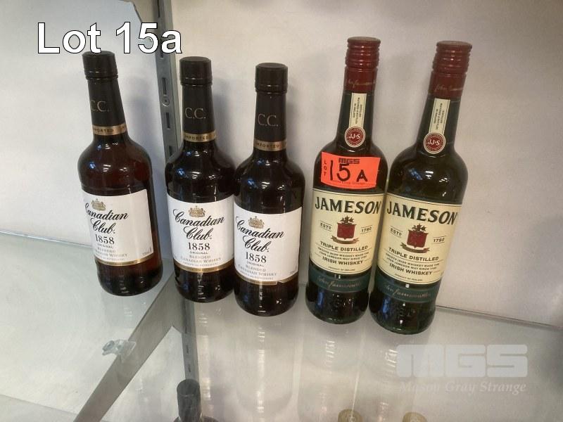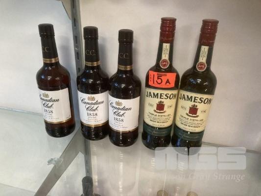 3 x BOTTLES CANADIAN CLUB 1858, 700ml & 2 x BOTTLES JAMESON IRISH WHISKY, 700ml
