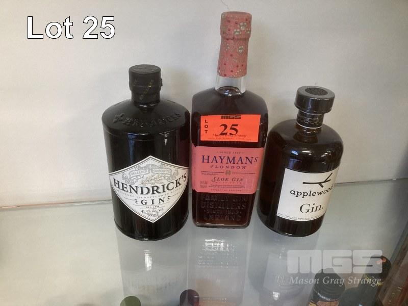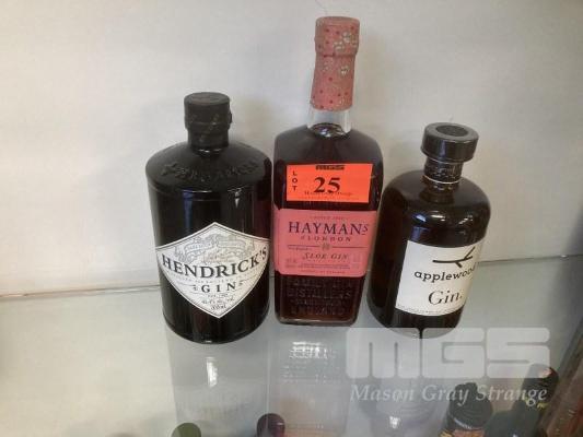 3 x BOTTLES ASSORTED GINS, HENDRICKS, HAYMANS & APPLEWOOD