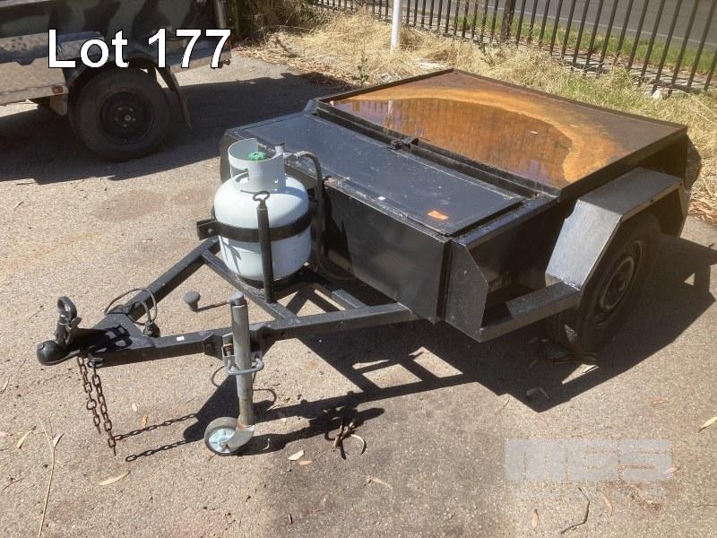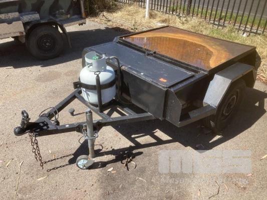 BBQ TRAILER, 5x4', SINGLE AXLE REG: TAT 749 WITH 4 BURNER HOT PLATE COLD BOX GAS BOTTLE BALL HITCH (NO REG PAPERS)