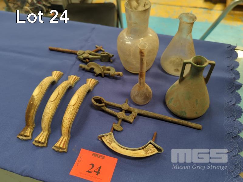 VINTAGE SCIENTIFIC EQUIPMENT, BEAKERS, ROD HOLDERS WITH ASSORTED COLLECTABLES