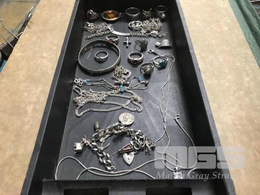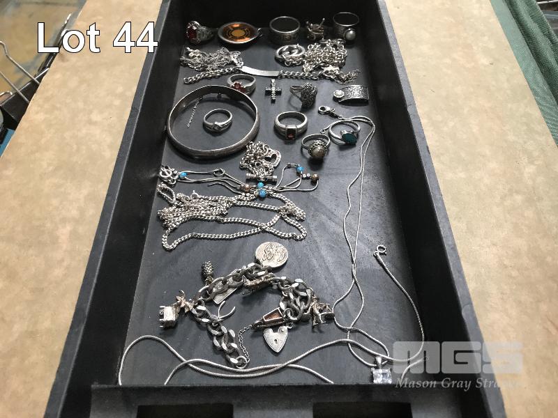 COLLECTION OF HALLMARKED SILVER & STERLING SILVER JEWELLERY INC NECKLACES, CHAINS, CHARM BRACLET, RINGS, BANGLE ETC OVER 200gms
