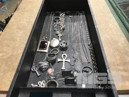 COLLECTION OF HALLMARKED SILVER & STERLING SILVER JEWELLERY INC NECKLACES, CHAINS, CHARM BRACLET, RINGS, BANGLE ETC OVER 200gms