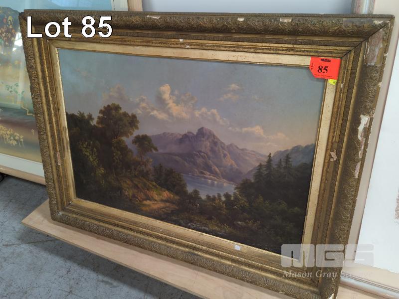 FRAMED OIL ON CANVAS PAINTING MOUNTAIN & LAKE SCENE, DAMAGE TO CANVAS & FRAME