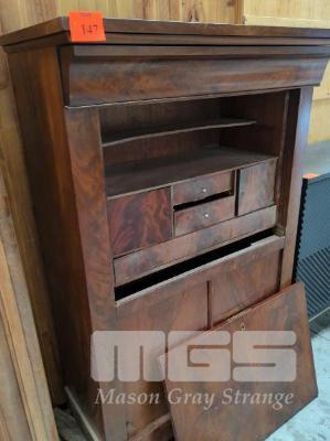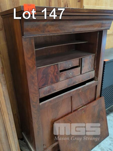 FLAME MAHOGANY SECRETAIRE, 4 DOOR, 2 DRAWER WITH FALL FRONT WRITING DESK, DAMAGED