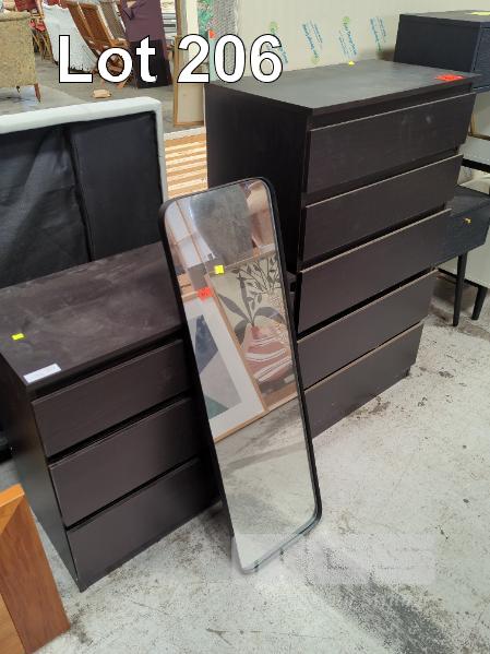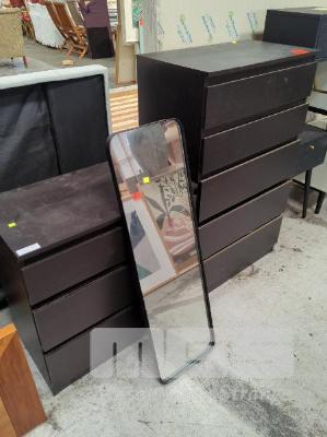 BROWN WOODGRAIN LAMINATE, 5 DRAWER TALLBOY, 3 DRAWER LOWLINE DRAWER UNIT & WALL MIRROR