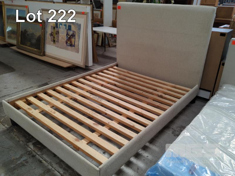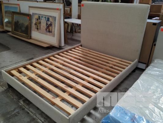 BEIGE FABRIC UPHOLSTERED QUEEN SIZE BED FRAME, NO MATTRESS