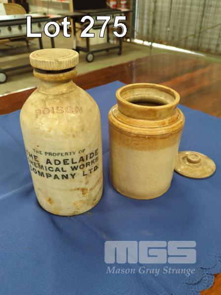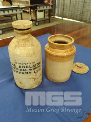 POTTERY CANISTER & PORCELAIN DEMIJOHN, THE ADELAIDE CHEMICAL WORKS WITH STOPPER