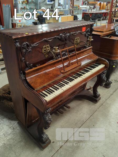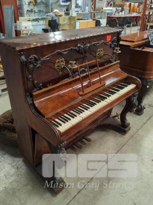 ANTIQUE UPRIGHT PIANO, BRAND UNSIGHTED, ORNATE WOOD CARVINGS, COMPLETE WITH PAIR BRASS SCONCES, EARLY TO MID 1800's BUILD