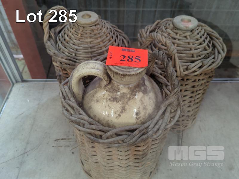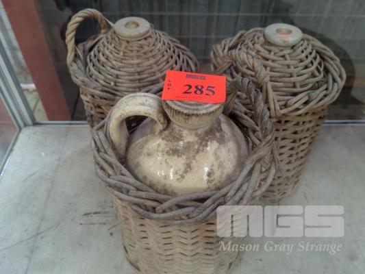 3 x PORCELAIN BASKETED CHEMICAL DEMIJOHNS, 1 x WITH STOPPER