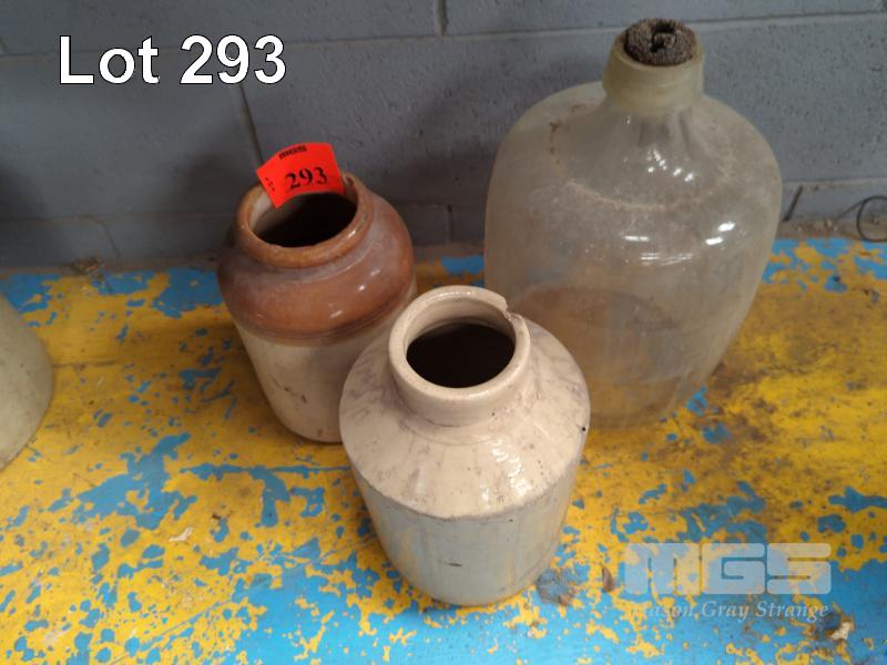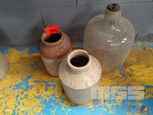2 x POTTERY CANISTERS & LARGE GLASS BOTTLE