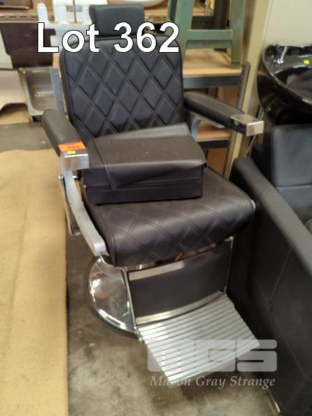 BARBERS CHAIR, BLACK VINYL UPHOLSTERED, CHROME FOOT STAND, HAND PUMP, GAS LIFT & MATCHING FOAM RAISER