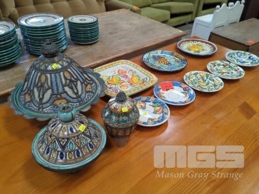 3 x LEADLIGHT LIDDED DISHES, PAINTED PLATES