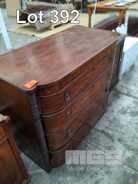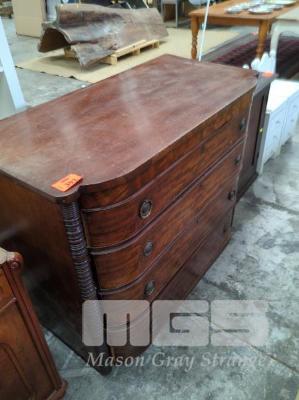 FLAME MAHOGANY 4 DRAWER CHEST, TURNED TIMBER SIDE COLUMNS, BOWED FRONT, 60 x 120cm