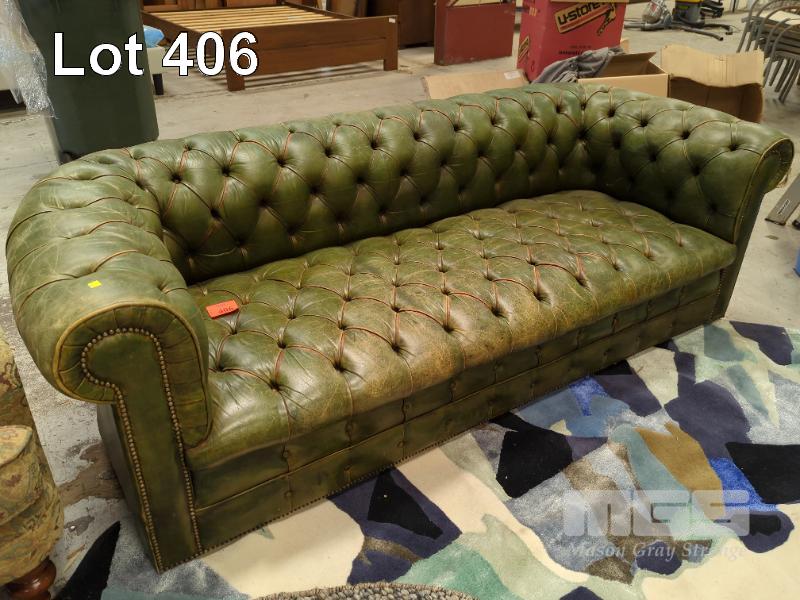GREEN LEATHER UPHOLSTERED CHESTERFIELD LOUNGE, LEATHER CRACKED IN PLACES, REQUIREDS RESTORATION