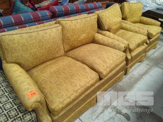 3 PIECE LOUNGE SUITE, GOLD FABRIC COMPRISING 2 SEATER & 2 x SINGLE SEATER ARM CHAIRS ON CASTORS
