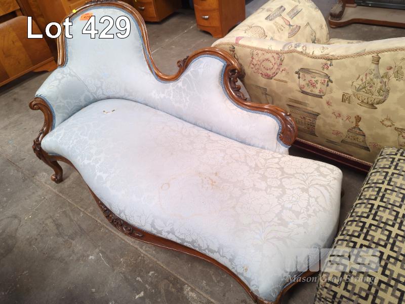 BLUE FABRIC UPHOLSTERED CHAISE LOUNGE, DECORATIVE CARVED TIMBER FRAME, TEAR IN FABRIC