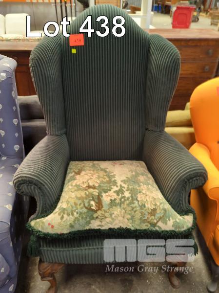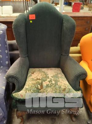 GREEN CORDUROY FABRIC UPHOLSTERED HIGH BACK LIBRARY ARM CHAIR