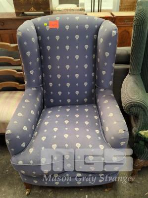 BLUE FABRIC UPHOLSTERED WING BACK ARM CHAIR