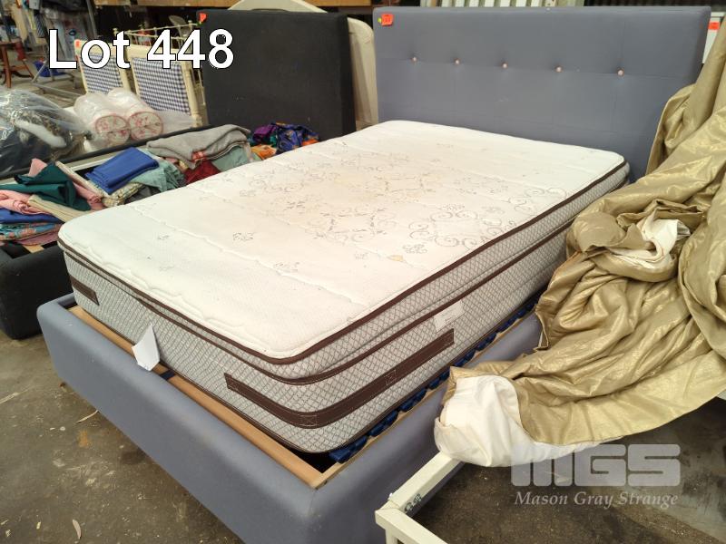 DOUBLE BED WITH GREY FABRIC UPHOLSTERED BED BASE, SEALY POSTUREPEDIC GRAND DELUXE PILLOW TOPPED MATTRESS & SINGLE TRUNDLE BED UNDERSTORAGE, NO MATTRESS