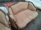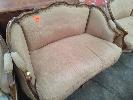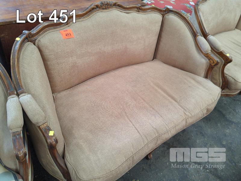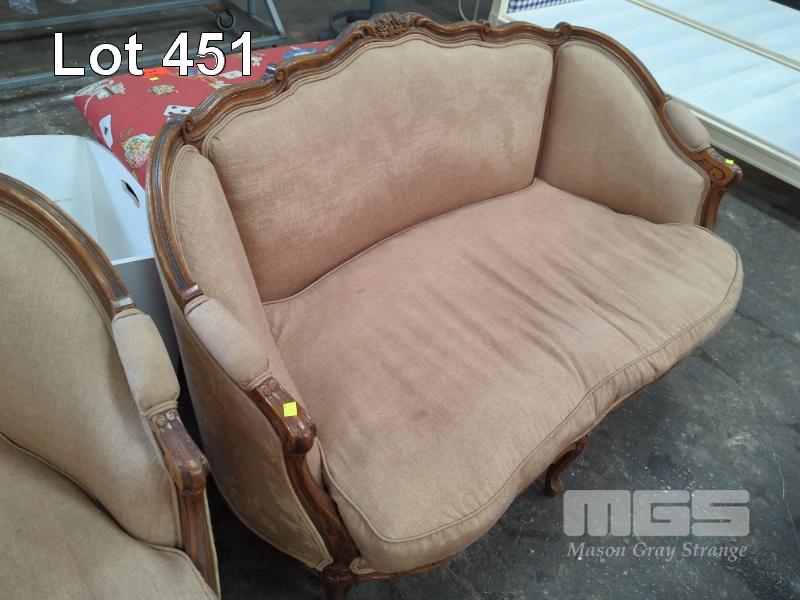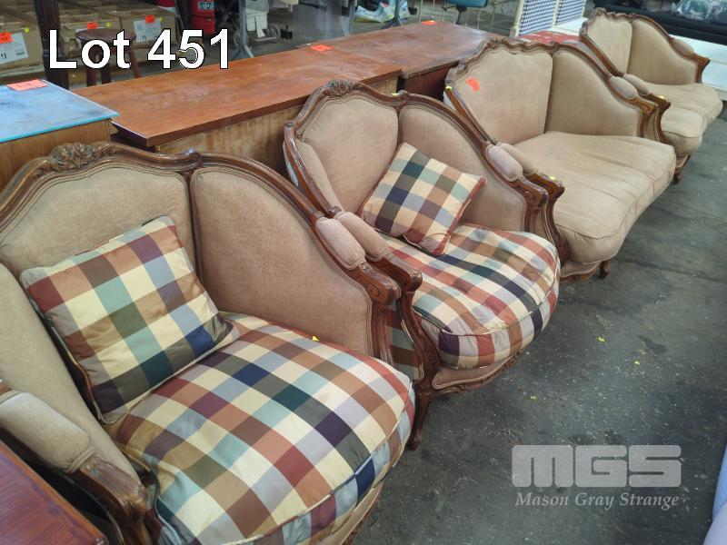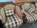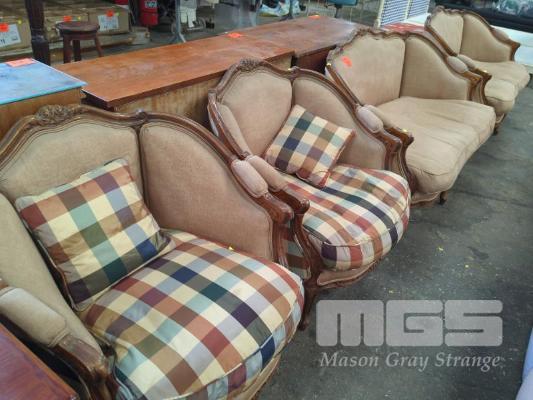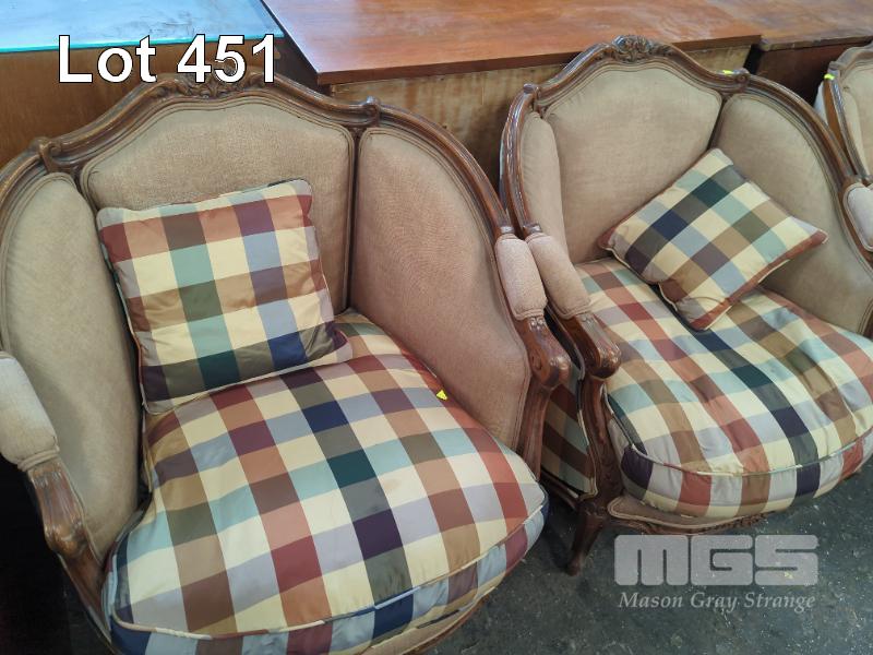 PAIR VICTORIAN STYLE 2 SEATER SOFAS WITH DECORATIVE CARVED TIMBER FRAMES & PAIR ARM CHAIRS WITH TARTAN CUSHIONS