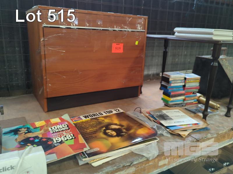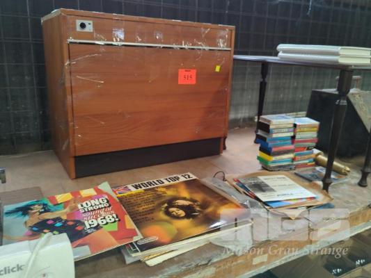 STEREO CABINET, LP RECORDS, 45'S, CASSETTES & SIDE TABLE