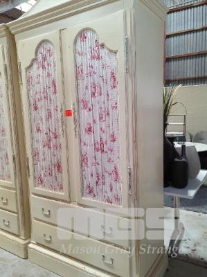 WHITEWASH HAMPTON STYLE CABINET, 2 DOOR CHICKEN WIRE & FABRIC FRONTED WITH 2 DRAWER UNDERSTORAGE