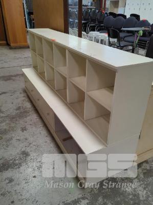 3 x WHITE PIGEONHOLE UNITS WITH 2 x HAVING UNDERSTORAGE,1 x MISSING DRAWER