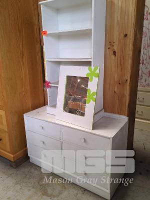 WHITE PAINTED 6 DRAWER CHEST, WALL MIRROR & BOOKCASE
