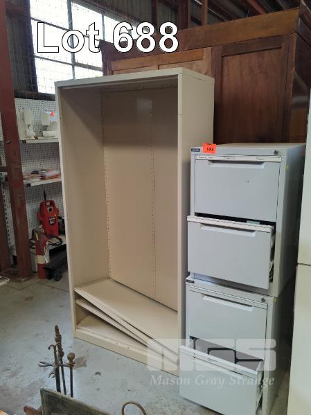 2 x GREY STEEL 2 DRAWER FILING CABINETS & BEIGE STEEL SHELF UNIT, NO SHELF CLIPS