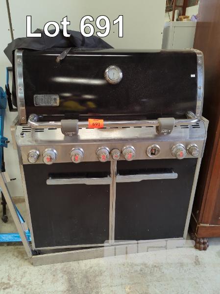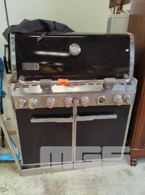 WEBER 5 BURNER HOODED BBQ WITH WARMING ELEMENT TO HOOD, 2 DOOR UNDERSTORAGE CONTAINING ROTISSERIE COMPONENTS, 1 x KNOB MISSING