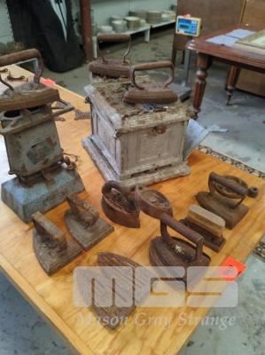 THE ELGIN GRILLS IRON WARMER, CAST CASING ENAMELED IRON WARMER & COLLECTION IRONS & TRIVETS