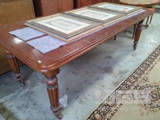 DINING SUITE, 13 PIECE COMPRISING 3 LEAF EXTENSION RECTANGULAR DINING TABLE & 12 x SPADE BACKED BLUE FABRIC UPHOLSTERED DINING CHAIRS