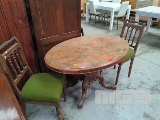 BURR WALNUT LOO TABLE, DECORATIVE CARVED SINGLE PEDESTAL BASE ON CASTORS WITH 2 X EDWARDIAN STYLE GREEN FABRIC UPHOLSTERED CHAIRS