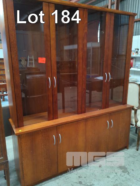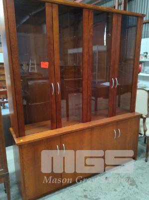 OAK VENEED GLASS DISPLAY CABINET. 4-DOOR WITH 4-DOOR UNDERSTORAGE
