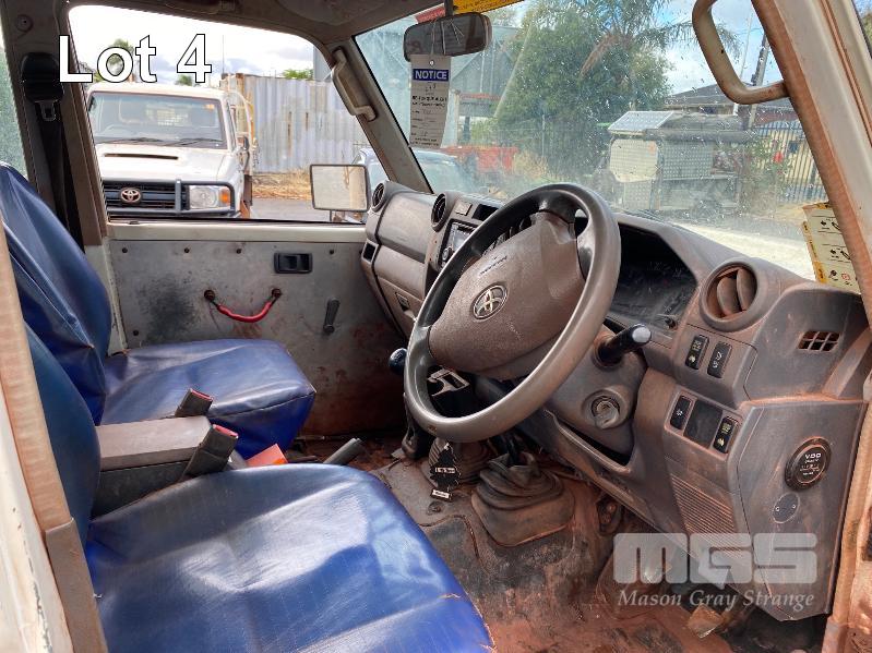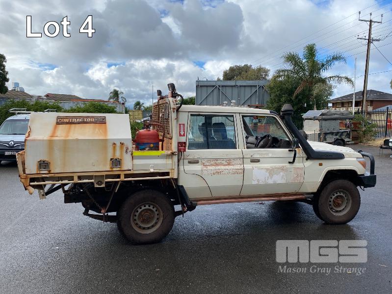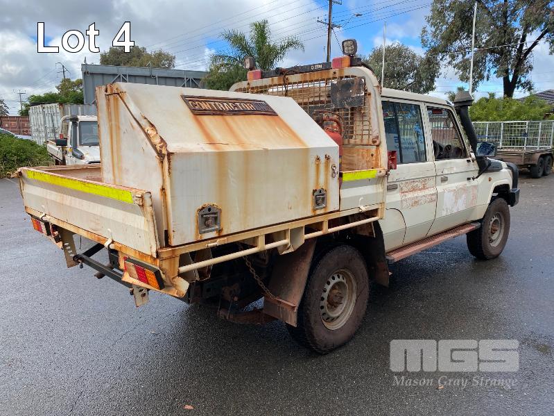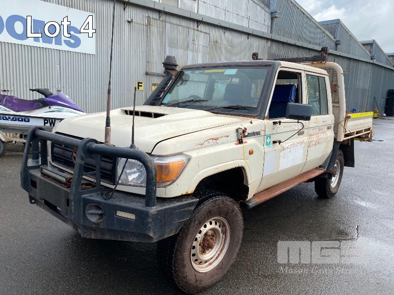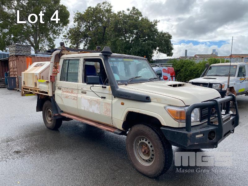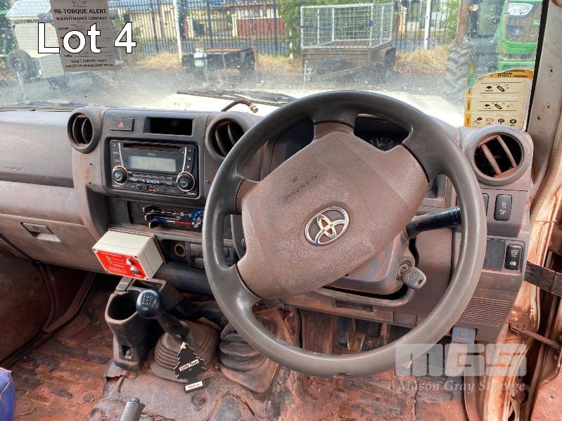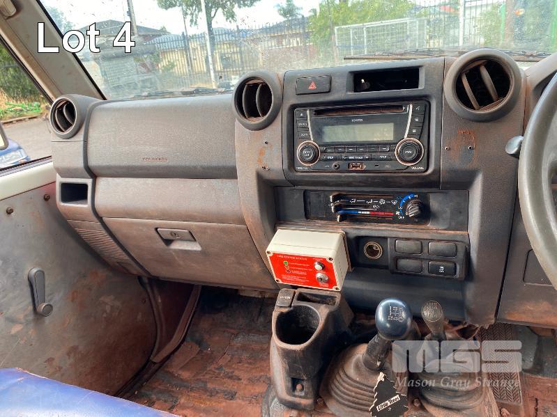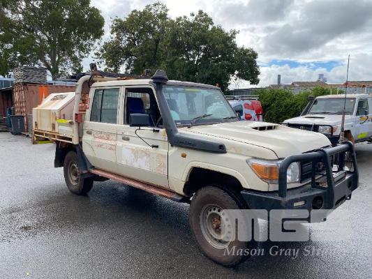 2019 TOYOTA LANDCRUISER VDJ79R DUAL CAB TRAY TOP 4x4 REG: NO PLATES VIN: JTEBV71J30B009432 ODO: 65,923kms SHOWING V8 TURBO DIESEL, 5 SPEED MANUAL TRANSMISSION, WHITE DUCO, 4 DOORS, 5 SEAT, 4x4 ABS, AIR BAG, AIR CON, BULL BAR, CARGO BARRIER, CD PLAYER, POWER STEERING, SIDE STEP, STEEL TRAY, MINE SPEC FITTED WITH BATTERY ISOLATION SWITCH, FIRE SUPPRESSION SYSTEM, TRAY MOUNT TOOL BOX, LED LIGHT BAR & ROOF MOUNT REAR LIGHTS KEY #15 ASSET # VD515 (WITH 1 KEY/S)