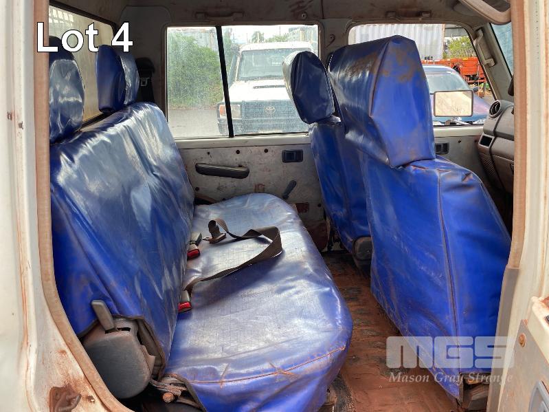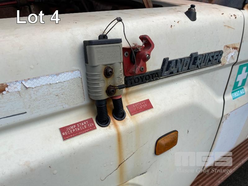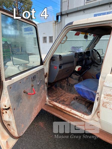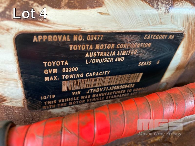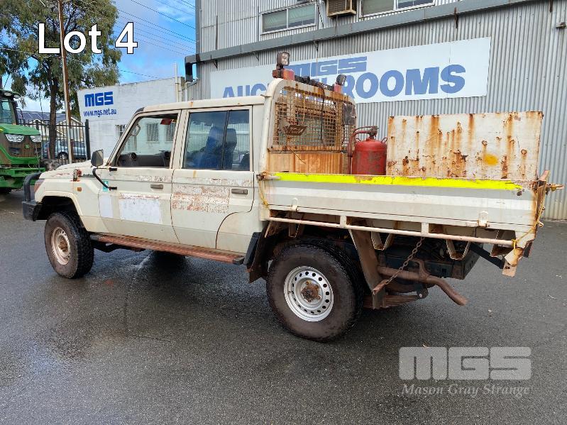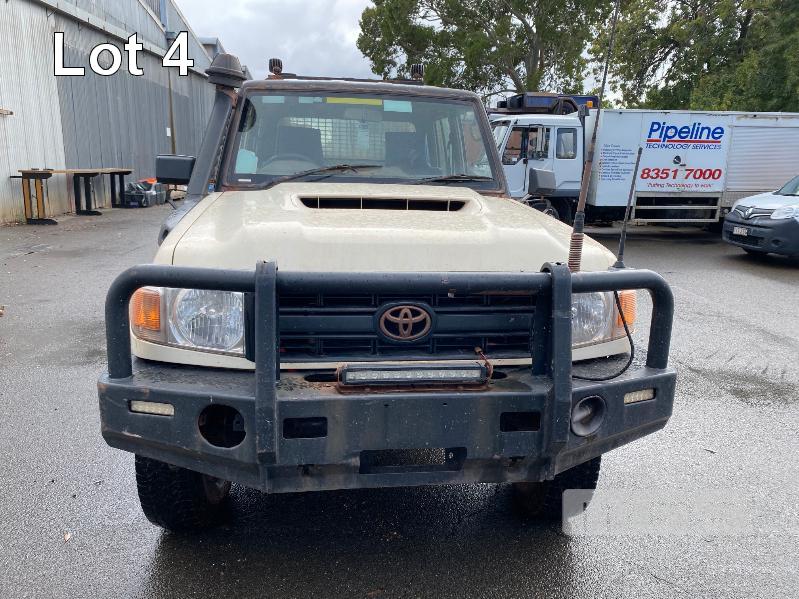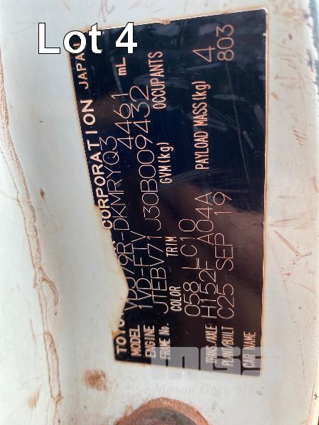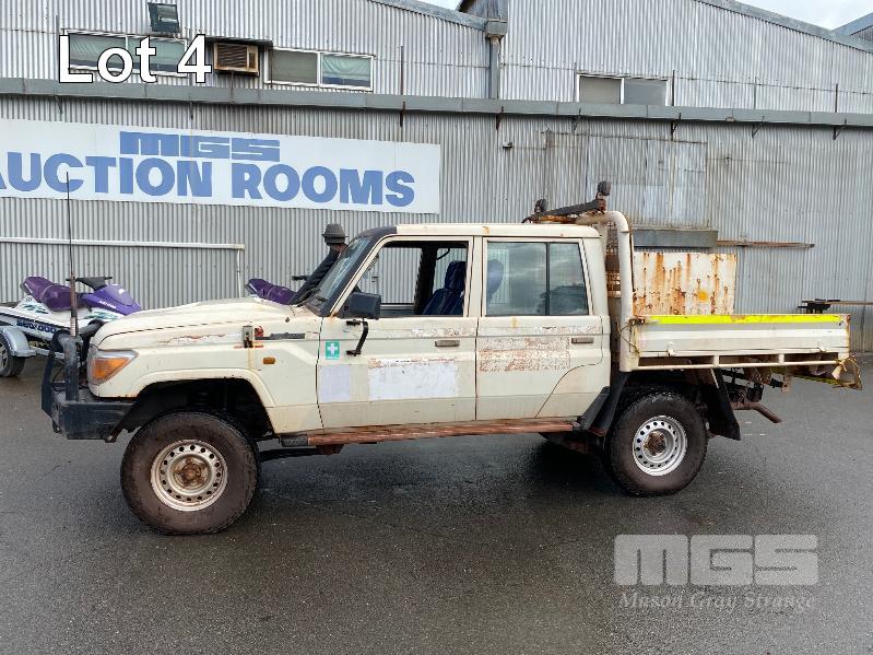 2019 TOYOTA LANDCRUISER VDJ79R DUAL CAB TRAY TOP 4x4 REG: NO PLATES VIN: JTEBV71J30B009432 ODO: 65,923kms SHOWING V8 TURBO DIESEL, 5 SPEED MANUAL TRANSMISSION, WHITE DUCO, 4 DOORS, 5 SEAT, 4x4 ABS, AIR BAG, AIR CON, BULL BAR, CARGO BARRIER, CD PLAYER, POWER STEERING, SIDE STEP, STEEL TRAY, MINE SPEC FITTED WITH BATTERY ISOLATION SWITCH, FIRE SUPPRESSION SYSTEM, TRAY MOUNT TOOL BOX, LED LIGHT BAR & ROOF MOUNT REAR LIGHTS KEY #15 ASSET # VD515 (WITH 1 KEY/S)