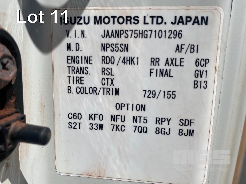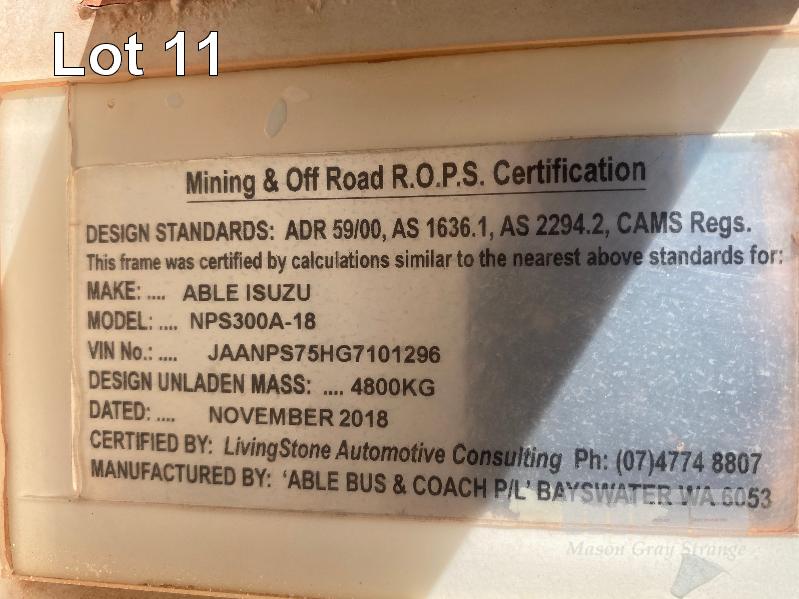 2018 ISUZU NPS300A-18 NHNP 4x4 PERSONNEL TRANSPORT TRUCK REG: NO PLATES VIN: JAANPS75HG7101296 ODO: 42,898kms SHOWING GVM: 7,500kg GCM: 1,100kg ISUZU, 4 CYLINDER TURBO DIESEL, 5 SPEED MANUAL TRANSMISSION, SPRING SUSPENSION, WHITE DUCO, 3 DOORS, 17 SEAT, AIR CON, BULL BAR, STEEL RIMS, MINE SPEC FIRE SUPPRESSION SYSTEM ABT BRAKE SYSTEM REVERSE CAMERAS ROPS CERTIFICATION, ROOF EMERGENCY EXIT HATCH BATTERY ISOLATION SWITCHES REAR LUGGAGE COMPARTMENT KEY#50 ASSET #TS050 (WITH 1 KEY/S, WITH OWNER'S MANUAL, WITH SERVICE BOOKS)