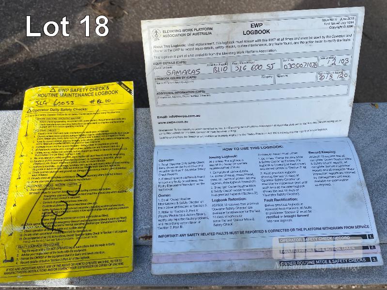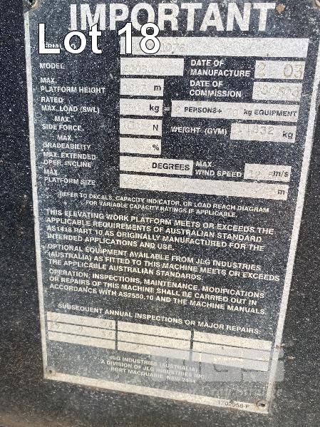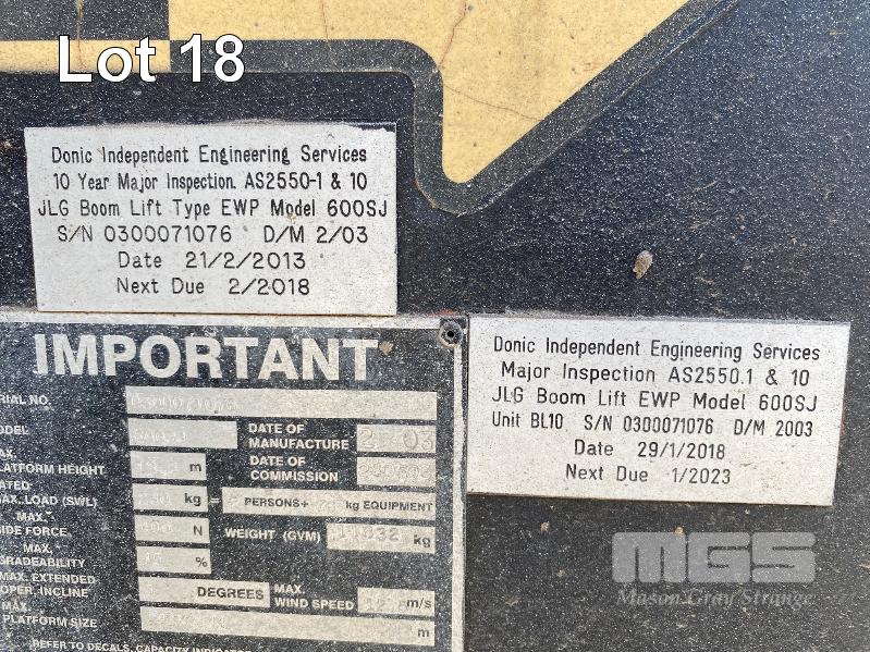 2003 JLG BOOM LIFT, ROUGH TERRAIN, MOD: 600SJ S/NO: 0300071076 POWERED BY 4 CYLINDER DEUTZ DIESEL ENGINE MOD: BFM4D1L HOURS: 6,285 SHOWING 4x4 WHEEL DRIVE & STEER MAX PLATFORM HEIGHT: 18.3m MAX LOAD: 230kg (2 PERSON + 70kg) PLATFORM SIZE: 910 x 2440mm GVM: 11,832kg LAST MAJOR INSPECTION DATE: 29/1/2018 WITH LOG BOOKS KEY #30