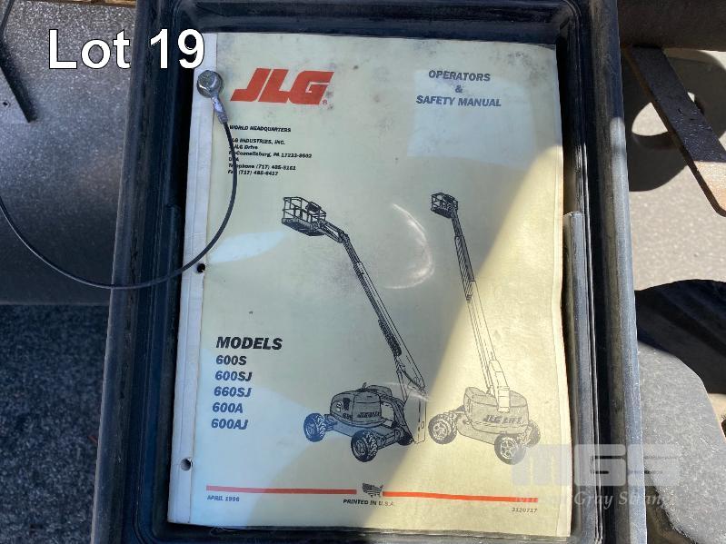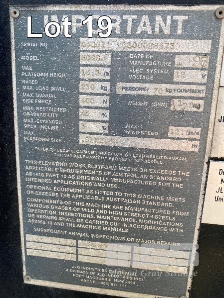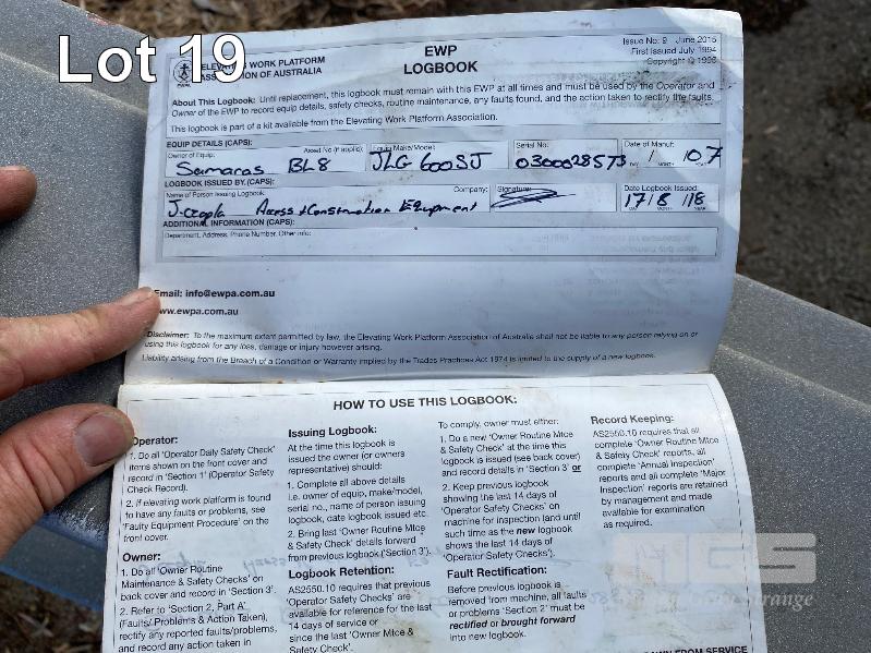 1996 JLG BOOM LIFT, ROUGH TERRAIN, MOD: 600SJ S/NO: 040811-0300028573 POWERED BY 4 CYLINDER DEUTZ DIESEL ENGINE MOD: BFM4D1L HOURS: 8,082 SHOWING 4x4 WHEEL DRIVE & STEER MAX PLATFORM HEIGHT: 18.3m MAX LOAD: 230kg (2 PERSON + 70kg) PLATFORM SIZE: 910 x 2440mm GVM: 11,793kg WITH LOG BOOK LAST MAJOR INSPECTION DATE: 29/1/2018 KEY #29