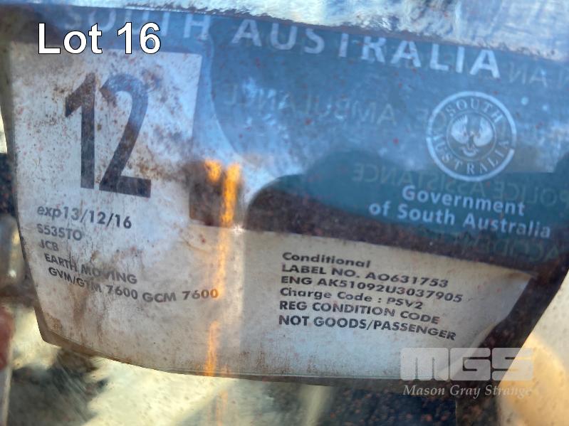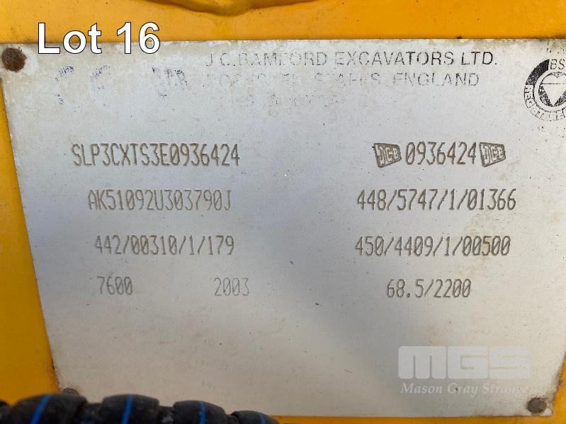 2003 JCB 3CX SITEMASTER 4x4 BACKHOE REG: S48 SKY (SA) PIN: SLP3CXTS3E0936424 ENG: AK51092u3037905 HOURS: 7,989hours SHOWING GVM: 7,600kg GCM: 7,600kg PERKINS DIESEL 68kw, 4 IN 1 BUCKET, 1m3 WITH FOLDING FORK ATTACHMENT SWL: 1,000kg 2 x TRENCHING BUCKETS KEY #38