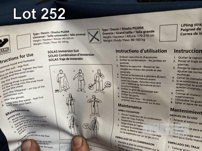 4 x VIKING SOLAS IMMERSION SUITS MOD: PS2004 DOM: 2016 SIZE: UNIVERSAL HEIGHT: 170-210cm WEIGHT: 80-160kg HIGH VISIBILITY YELLOW REFLECTIVE TAPE FOR HIGH VISIBILITY IN THE DARK THERMAL PROTECTION IN COLD WINTER IN CARRY BAG